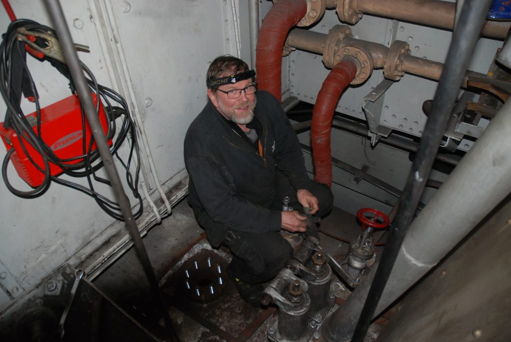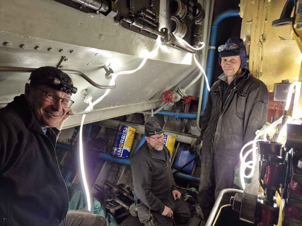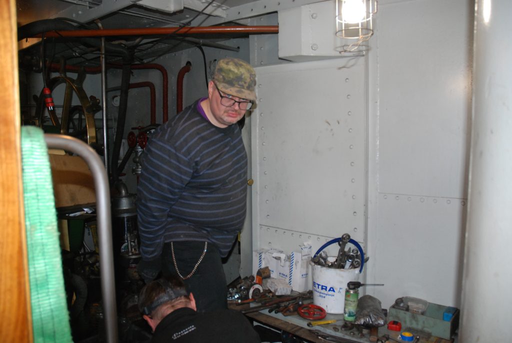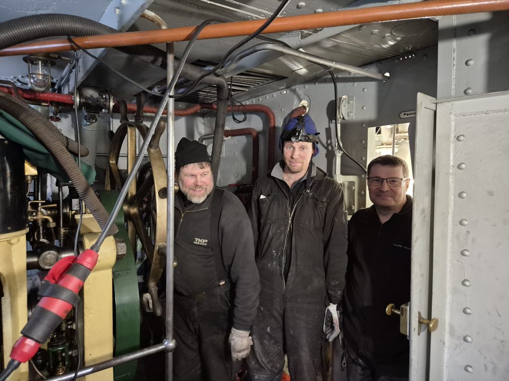 iedotteen aluksi lyhyt yhteenveto kevään ja kesän aikana tehdyistä laajoista tekniikan kunnossapitotöistä. Syksyllä aloitetut ja pitkin talvea tehdyt, venttiilien ja pinnapulttien korjaus ja huoltotyöt sekä muutkin aloitetut kunnostukset jatkuivat heti venemessujen jälkeen. Töitä saimme jatkaa telakan laiturissa. Alun perin oli tarkoitus korjata ja huoltaa molempien kattiloiden isot venttiilit, mutta projekti oli sen verran työläs, että päätettiin keskittyä tärkeysjärjestyksessä, eli etummainen kattila ensin ja takakattilan vastaavat työt päätettiin tehdä 2025-2026 aikana. Lisäksi joitain putkia ja venttileitä uusittiin kokonaan ja muitakin kohteita huollettiin, saadaksemme aluksen risteilykuntoon kesäksi. Tekniikan kunnostuksen pääsääntöisesti hoiti sama ryhmä, joka työt syksyllä aloitti, eli Timo Turunen, Olavi Manninen ja Juhani (Jussi) Martti ovat vastanneet varsin isosta urakasta. Luonnollisesti talkoiden yhteydessä apujoukkoja oli myös auttamassa.