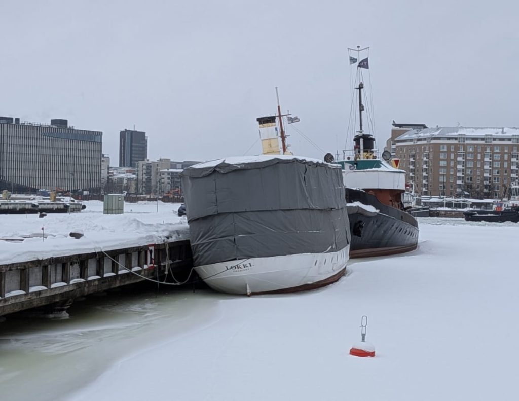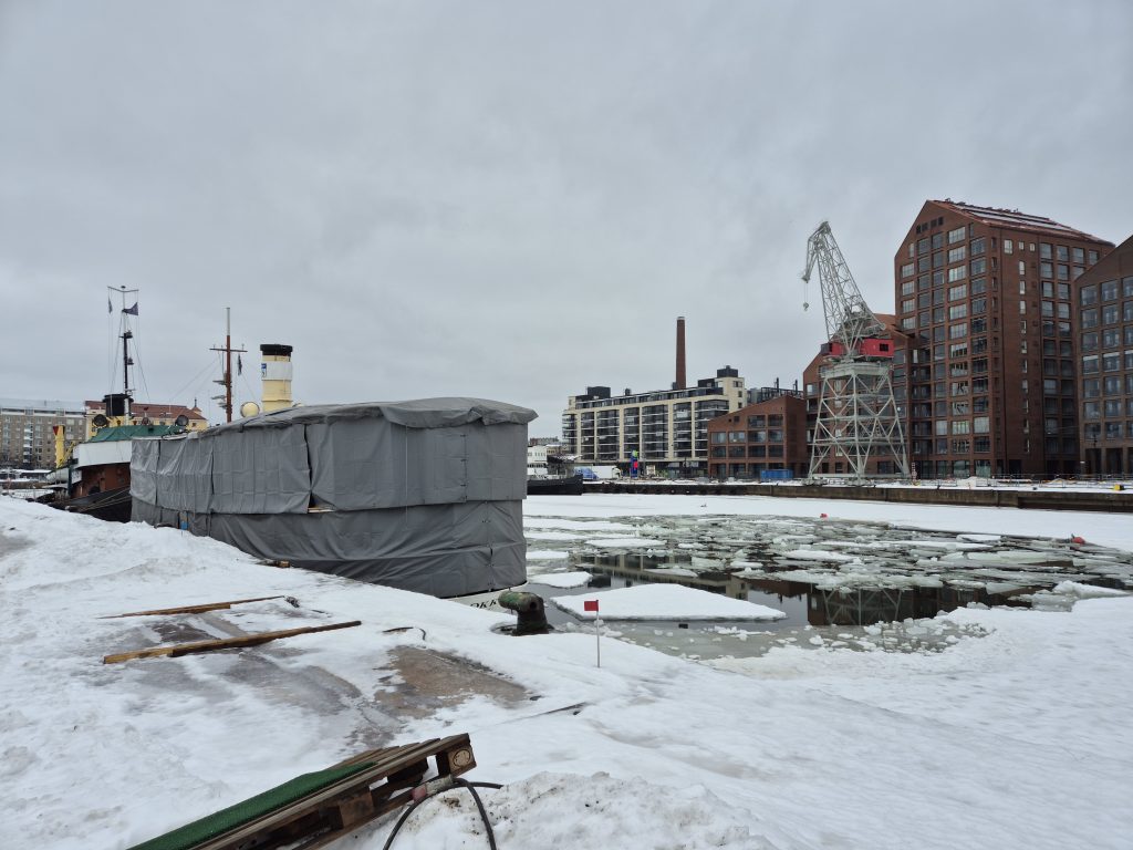 Poikkeuksellinen jäätilanne Hietalahdessa. Tukijamme Håkansin hinaaja m/s H Kanter kävi murtamassa 27.2 jäätä alusten vierellä ja alusten asennot suoristui.
