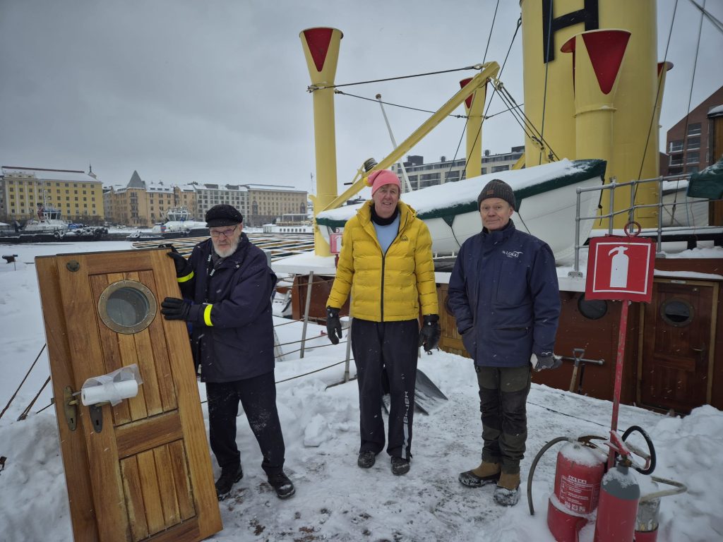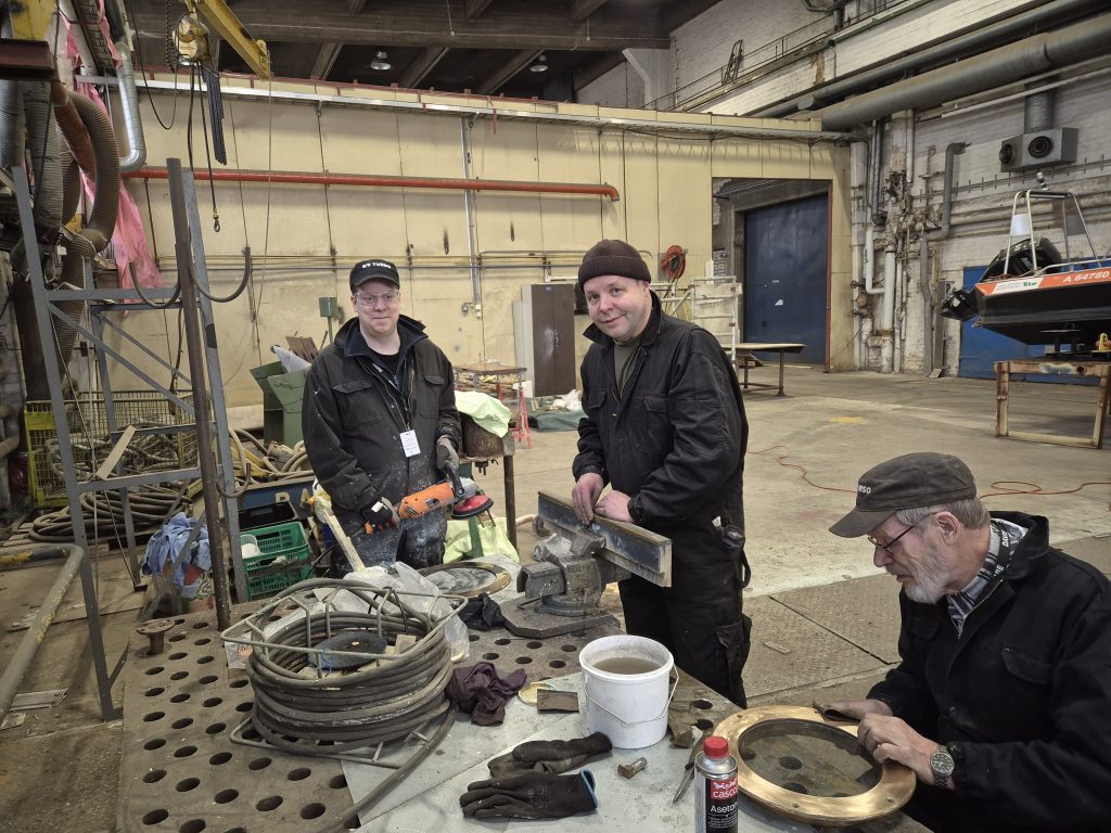 Kunnostustöitä on tehty pitkin talvea pienen aktiivijoukon avulla. Tänä talvena hanketta helpotti osin se, että saimme telakalta käyttöömme aivan Turson laituripaikan lähetä lämmintä sisätilaa. Olemme siirtäneet alukselta mm. irrotetun pumpun perusteelliseen korjaukseen sekä muutamia putkia on irrotettu huoltoon ja osin uusittavaksi. Myös mahonkiovien hionnat ja lakkaukset sekä messinkiosien puhdistukset tehdään kevään aikana valmiiksi. Tekniikan puolella on useita muitakin kunnostuskohteita työn alla. Alla ainoastaan muutama otos osasta kohteita ja puuhamiehiä.